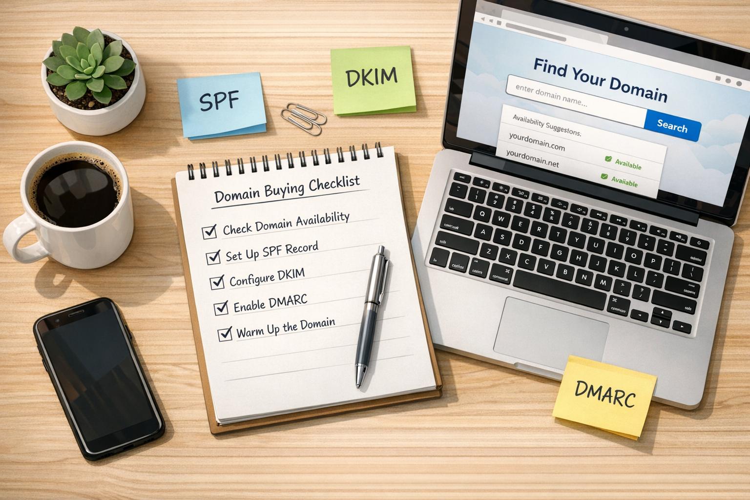 Checklist to buy, verify, and configure domains for email outreach: pick aged .coms, check history, set SPF/DKIM/DMARC, warm up, and use multiple domains.